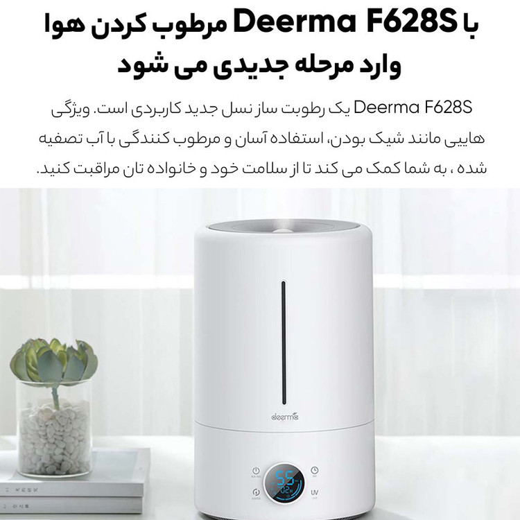 دستگاه بخور و رطوبتساز سرد 5 لیتری برند درما، مناسب برای فضای 30 مترمربع، منبع انرژی برق، با قابلیت تنظیم میزان رطوبت در سه حالت، نمایشگر LCD، دارای لامپ UV، مدل F628s