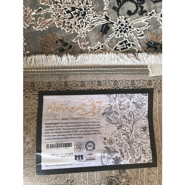 شرکت فرش آرمانی سالیان متوالیست به عنوان یکی از خوش سلیقه ترین تولید کنندگان فرش های فانتزی اقدام به تولید فرش ماشینی مینماید. این شرکت امروزه محصولات خود را در چندین کلکسیون به نام های باسیل، حسنا، زبرا و آذین به بازار عرضه مینماید که یکی از محبوتربن آنها کلکسیون باسیل است. این کلکسیون که طرحهای آن به طرحهای ترک نیز معروف است پیوند بسیار زیبایی بین فرش های سنتی ایرانی و طرحهای مدرن ایجاد کرده است. طرحهای کلکسیون باسیل ترکیبهای بسیار دلنشینی از رنگهای کرم، نسکافه ای و طوسی را شامل میشود که این رنگها امروزه مخاطبان بسیاری را به خود جلب نموده ند. تمام فرش های کلکسیون باسیل 700 شانه با تراکم 2400 و بافته شده با الیاف اکرلیک درجه یک میباشند. فرش ماشینی آرمانی کد 7101 یکی از طرحهای کلکسیون باسیل است که زمینه رنگی طوسی دارد.